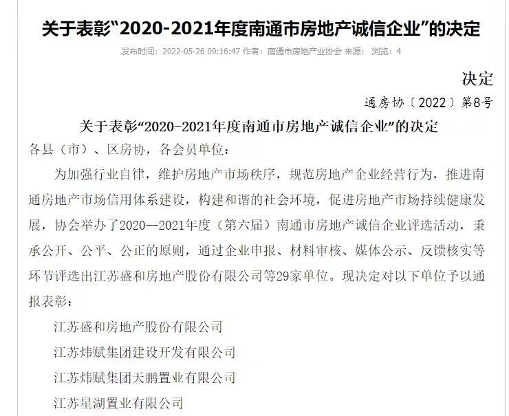 近日,南通市房地產(chǎn)業(yè)協(xié)會公布了關于表彰“2020-2021年度南通市房地產(chǎn)誠信企業(yè)”的決定。決定指出,協(xié)會秉承公開、公平、公正的原則,通過企業(yè)申報、材料審核、媒體公示、反饋核實等環(huán)節(jié)評選出江蘇盛和房地產(chǎn)股份有限公司等29家單位,予以通報表彰。